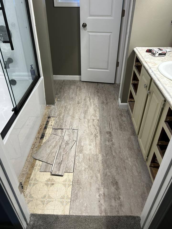 Tub/shower surround replacement. New flooring, trim, and bath fan. Drywall patching and new paint.