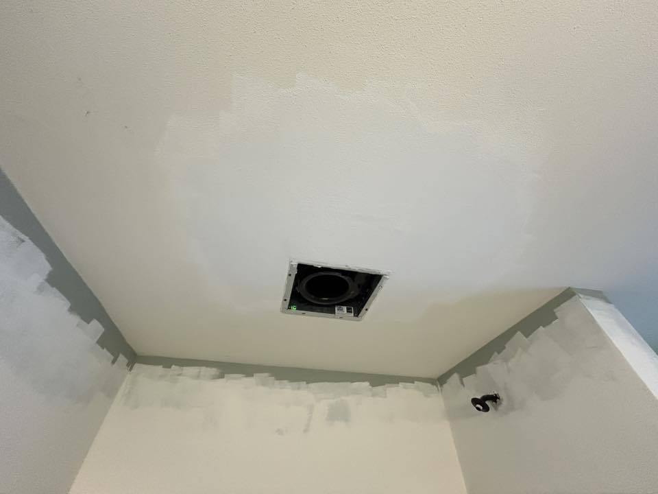 Tub/shower surround replacement. New flooring, trim, and bath fan. Drywall patching and new paint.