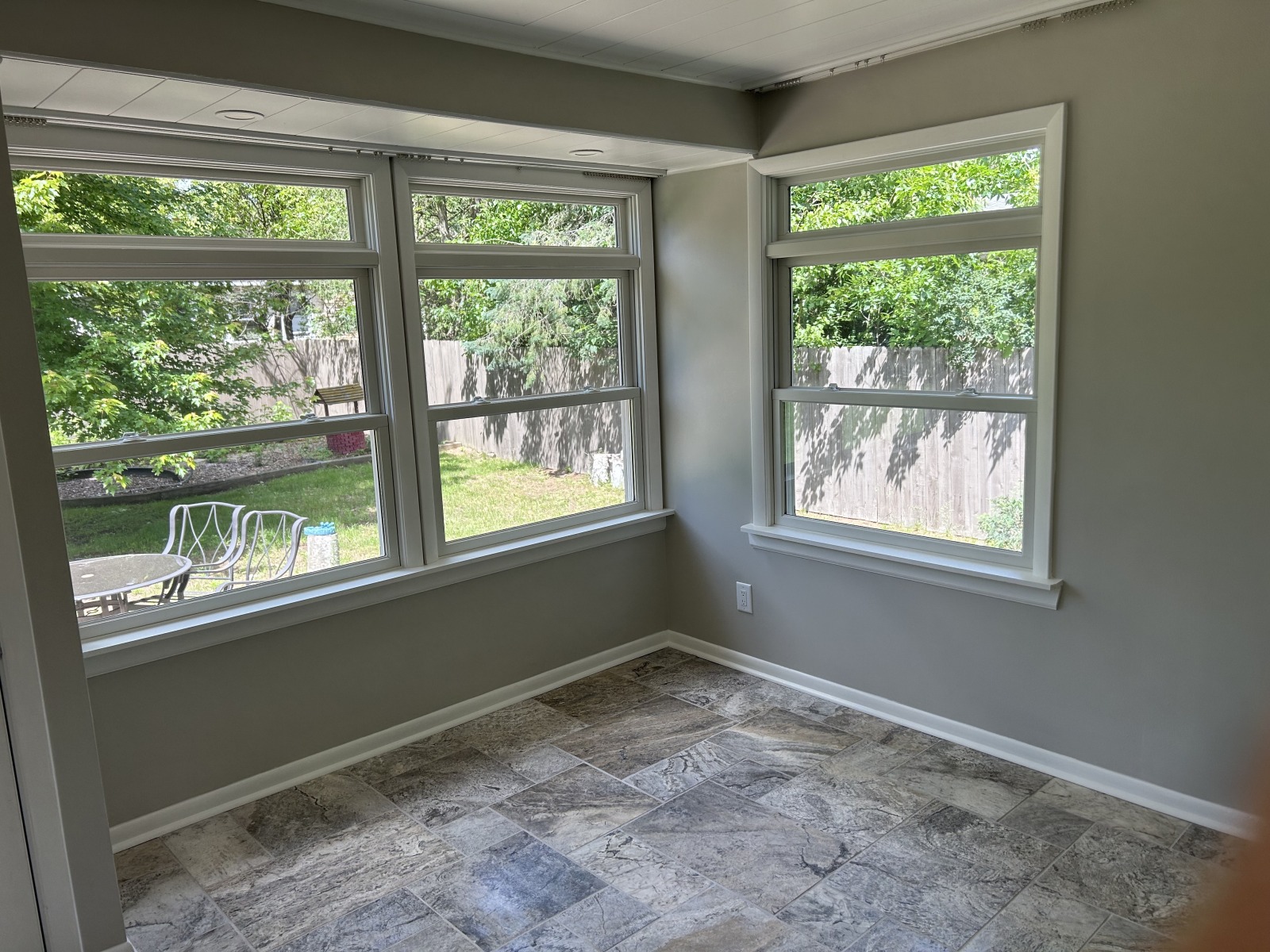 Tub/shower surround replacement. New flooring, trim, and bath fan. Drywall patching and new paint.